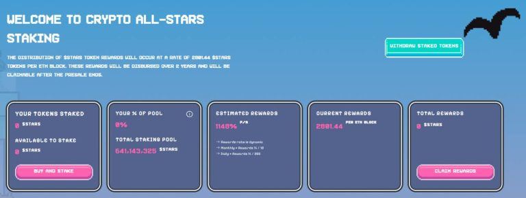 MemeVault 외에도 Crypto All-Stars는 자체 토큰인 $STARS를 위한 전용 스테이킹 프로토콜도 제공합니다. 이 옵션은 프로젝트에 투자하고 플랫폼 출시 전에 스테이킹을 통해 높은 수익을 얻으려는 사람들에게 이상적입니다.