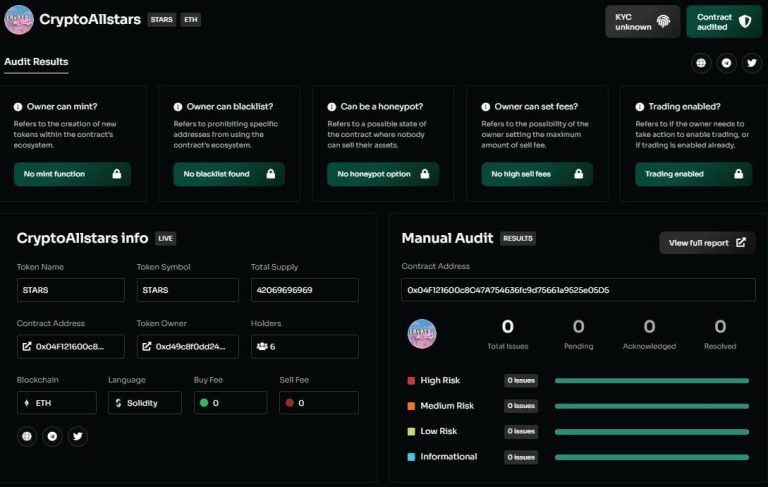이 프로젝트는 Coinsult와 SolidProof 모두에 의해 감사되었으며, 이는 스마트 계약의 무결성과 보안을 보장합니다. 이 감사 과정은 사용자들에게 플랫폼의 안전성에 대한 추가 신뢰를 제공하며, 새로운 암호화 프로젝트와 종종 관련된 위험을 줄입니다.