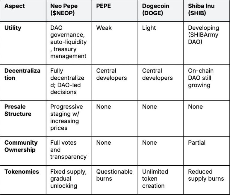 PEPE, Dogecoin (DOGE), Shiba Inu (SHIB) 같은 바이럴 경쟁자들과 Neo Pepe가 어떻게 비교되는지 궁금한가요? 여기 필요한 세부 분석이 있습니다.