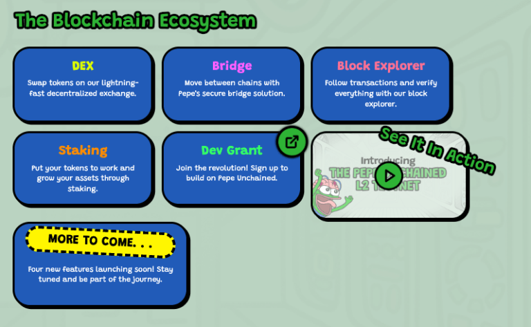 페페 언체인드 팀은 고수익의 스테이킹 앱과 개발자 보조금을 통해 혁신을 장려하는 전체 생태계를 구축하고 있습니다.