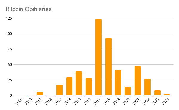 On the positive side, Chilean legislators are considering a proposal to create a strategic bitcoin reserve. I expect more countries are thinking about it behind closed doors. Despite prices having declined from Tuesday, sentiment online has largely remained positive. On a somewhat related note, the number of bitcoin obituaries – predictions of bitcoin’s demise – appears to be decreasing over time. Even the naysayers don’t think bitcoin is going anywhere.