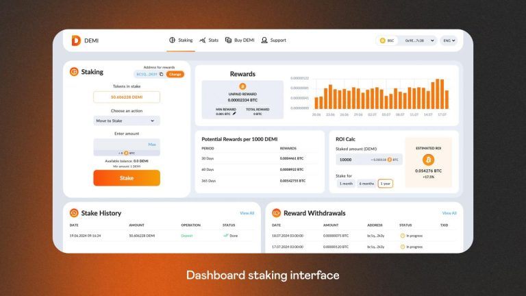 DeMi Token maintains a high level of transparency with users, sharing detailed information on how rewards are generated and providing updates on new equipment acquisitions. For instance, the most recent upgrade included the addition of 40 Whatsminer M50 units, each offering 120 TH at 28 W/TH. The project’s website features a Return on Investment (ROI) calculator that allows users to estimate potential income based on the staking duration and token amount, available in both USD and BTC. Additionally, the website displays key data such as the current hashrate, total Bitcoin mined (with over 20 BTC reported), pool information, and access to the White Paper outlining the tokenomics. The user dashboard provides comprehensive data, live statistics on equipment performance, energy consumption, and the number of mining units. Technical reports are regularly published to keep users informed about equipment status. The system is designed with a minimum payout threshold of 0.001 BTC, ensuring that rewards below this amount are saved in a personal account balance and paid out once the threshold is met.