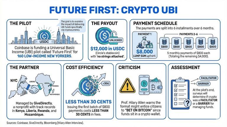 Coinbase membiayai percubaan pendapatan asas sejagat (UBI) yang dipanggil “Future First,” bertujuan untuk menyediakan sokongan kewangan kepada warganegara berpendapatan rendah dalam mata wang kripto. -