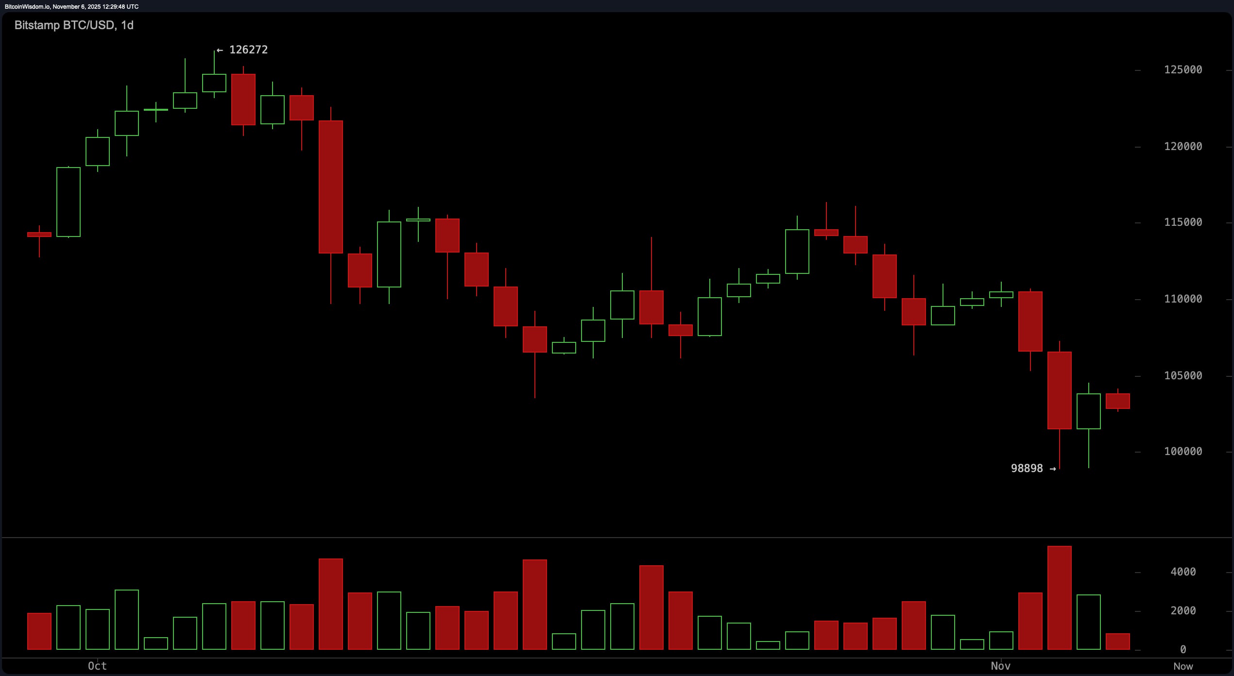 Carta harian memberikan naratif makro yang lebih ketara bersifat bearish, dicirikan oleh siri tinggi rendah dan rendah rendah yang konsisten. Penolakan dari $126,272 telah menyebabkan tekanan menurun yang berterusan, dengan $98,898 kini bertindak sebagai lantai sokongan yang penting. Penggabungan harga berhampiran $103,000 kekurangan volum bullish yang mencukupi, mencadangkan ketidaktentuan dan kemungkinan penerusan trend menurun. Penutupan harian yang disahkan di atas $108,000 hingga $110,000 diperlukan untuk memecahkan corak makro dan menetapkan momentum ke atas.