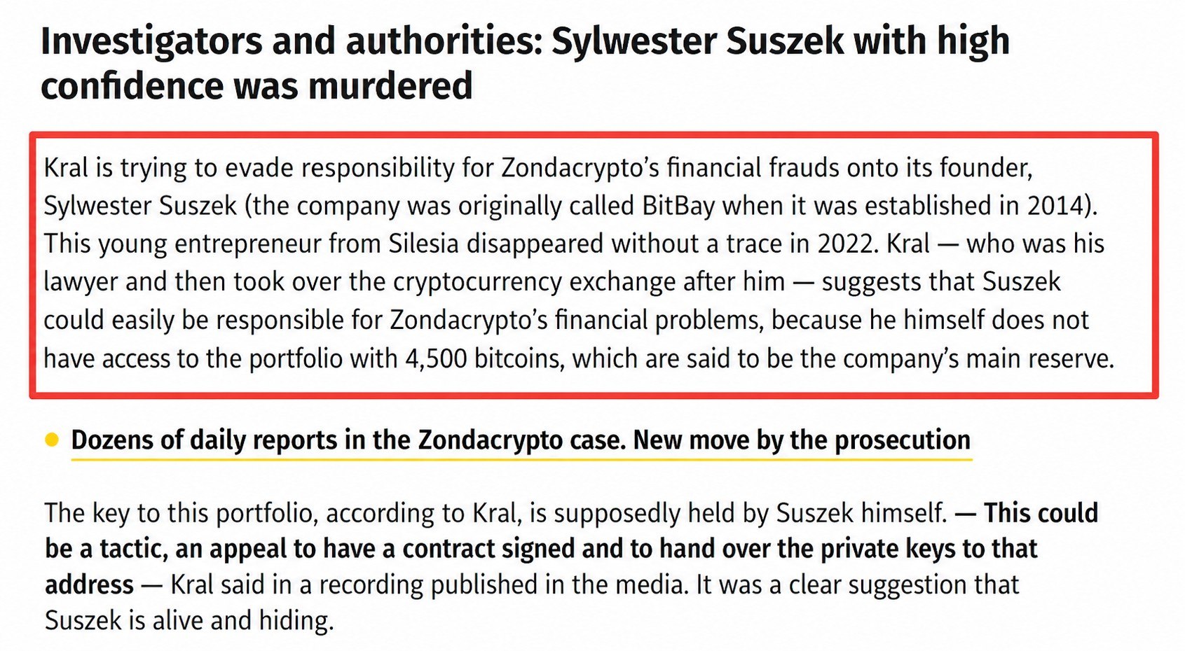 Dalam komunikasi awam terakhir yang didokumenkan, Kral mengesahkan bahawa dompet sejuk yang memegang 4,500 BTC telah menjadi tidak dapat diakses. Sejak itu beliau tidak mengeluarkan sebarang kenyataan awam, dan laporan daripada saluran media Poland Onet menunjukkan Kral telah berada di Israel selama kira-kira satu minggu. Pihak berkuasa Poland mengesahkan beliau memegang kewarganegaraan Israel, satu faktor yang secara ketara merumitkan sebarang usaha ekstradisi.