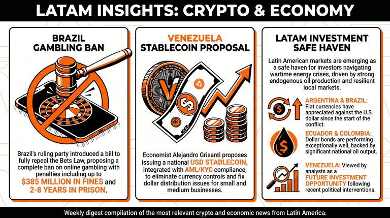Welkom bij Latam Insights, een overzicht van het belangrijkste cryptonieuws uit Latijns-Amerika van de afgelopen week. In deze editie: in Brazilië is een wetsvoorstel ingediend om alle online gokken te verbieden, in Venezuela wordt een voorstel gedaan om stablecoins in te zetten om de toenemende valutabeperkingen tegen te gaan, en Latijns-Amerika ontpopt zich als een interessante investeringsmogelijkheid temidden van oorlogsgeruchten.