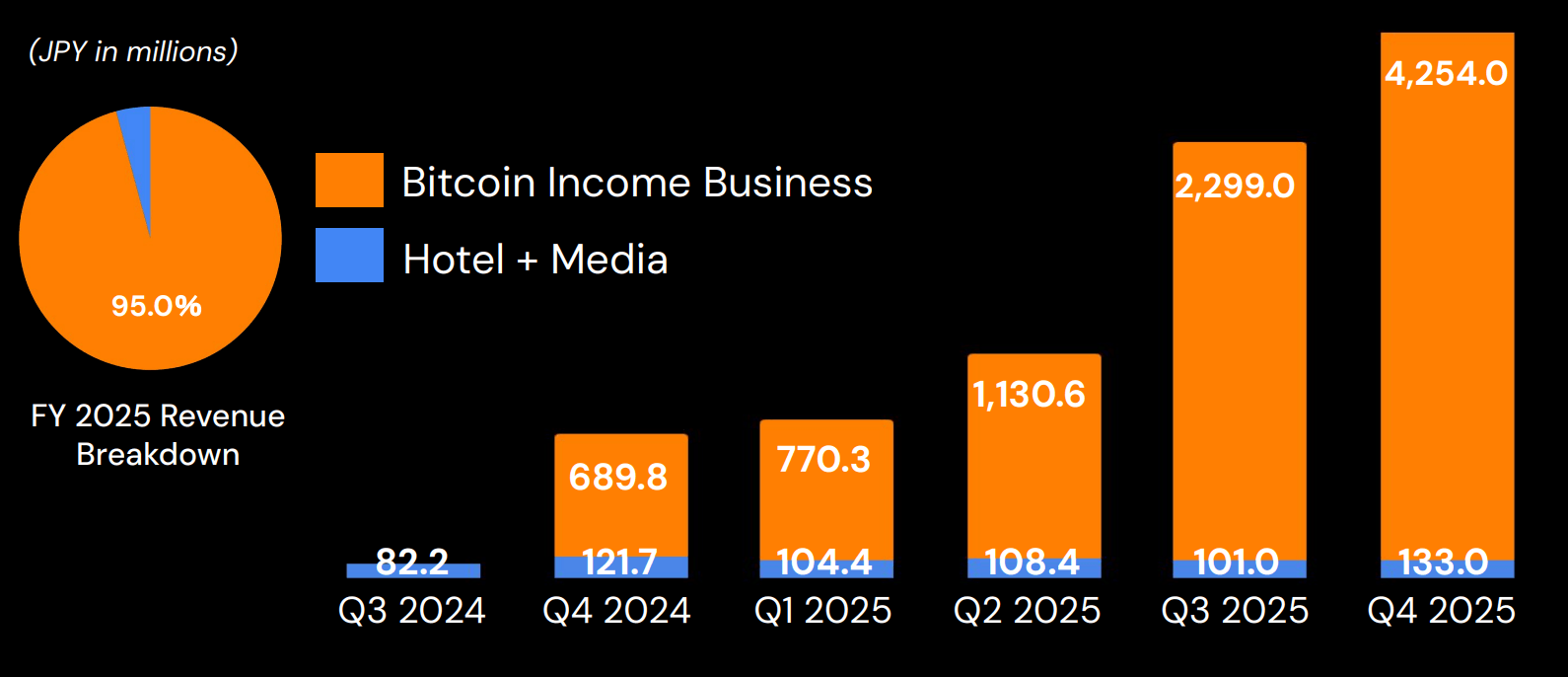 De groei versnelde vanaf het derde kwartaal, vooral gedreven door premie-inkomsten uit bitcoin-optietransacties. Metaplanet zei dat zijn bitcoin-inkomstenactiviteiten, gelanceerd in Q4 2024, zijn belangrijkste omzetmotor zijn geworden en naar verwachting centraal zullen blijven staan in de winstgroei.