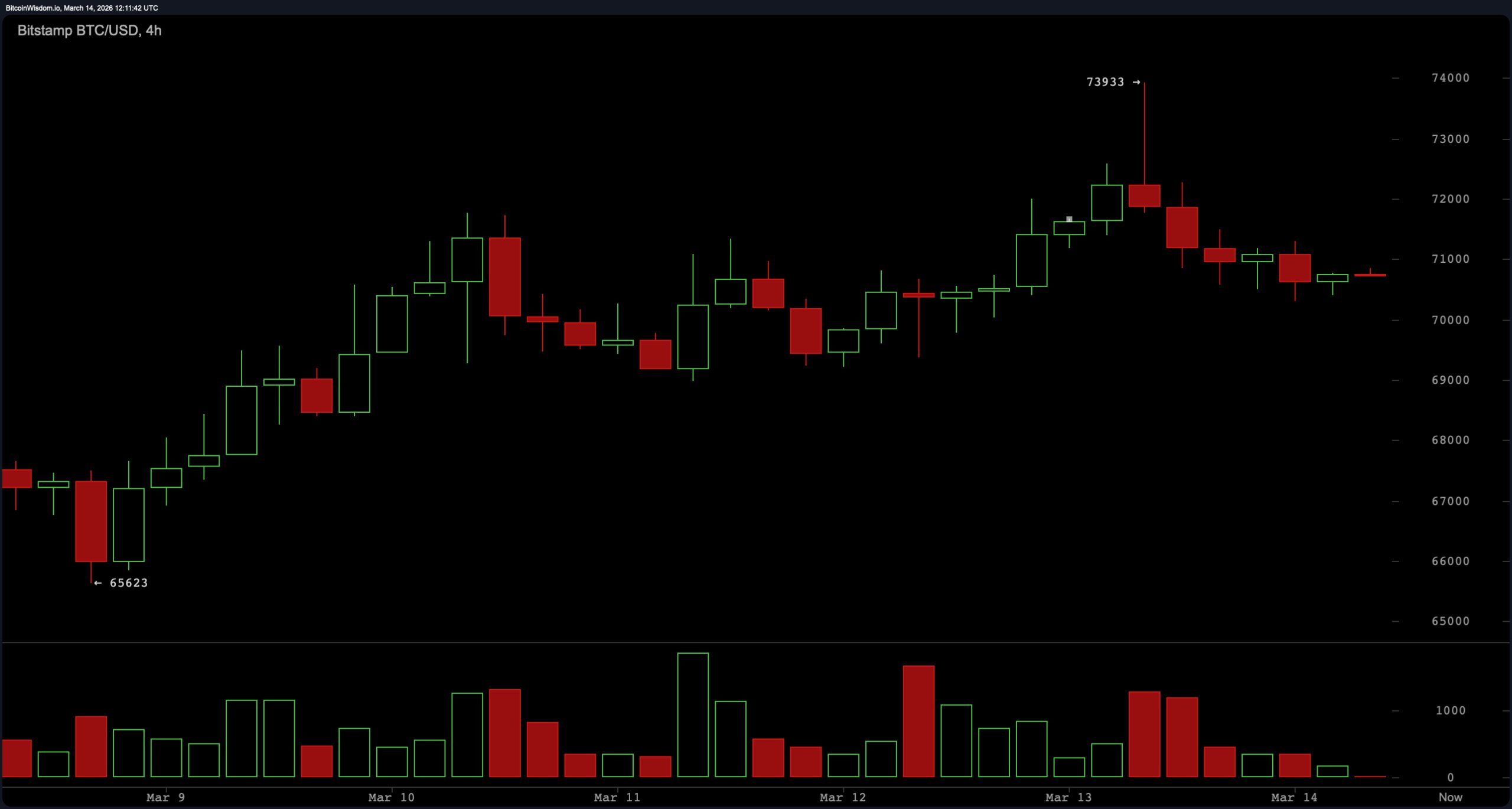 Bitcoin ble handlet til $70,795 den 14. mars 2026, med en markedsverdi på $1,41 billioner og et 24-timers handelsvolum på $49,48 milliarder. Kryptovalutaen beveget seg innenfor et intradagsintervall mellom $70,416 og $73,838, mens tekniske indikatorer på tvers av de viktigste tidsrammene reflekterte en nøytral markedsstruktur.