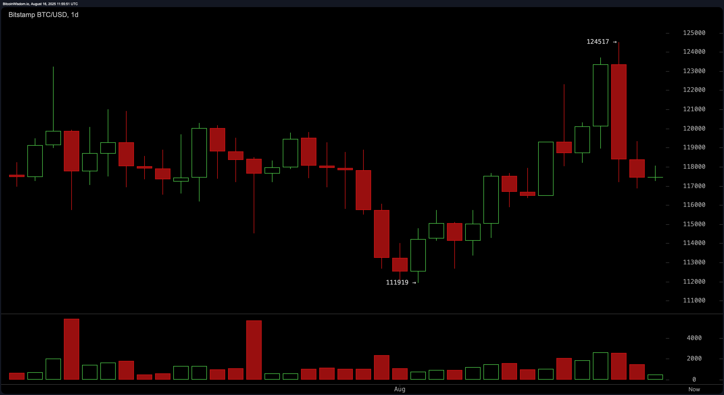 Bitcoin ble handlet til $117,509 den 16. august 2025, med en markedsverdi på $2,33 billioner. Det 24-timers handelsvolumet nådde $39,69 milliarder, med intradagspriser som svingte mellom $116,956 og $119,152.