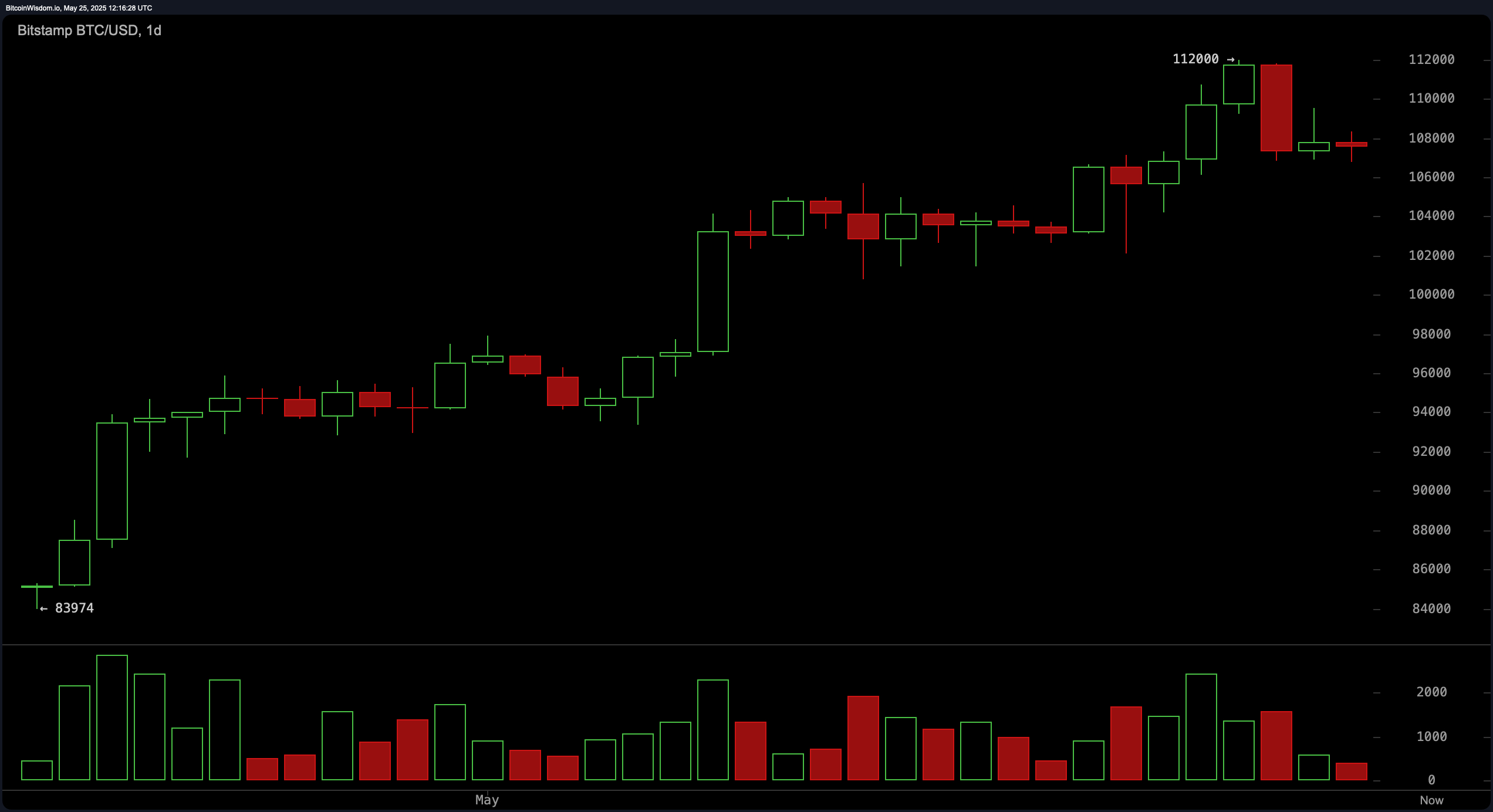 Bitcoin handlet til $107,259 med en markedsverdi på $2.13 billioner den 25. mai 2025. I løpet av de siste 24 timene nådde handelsvolumet $24.98 milliarder, med en intradagsprissvingning mellom $106,954 og $109,225, noe som reflekterer kortsiktig volatilitet og aktiv markedsdeltakelse.