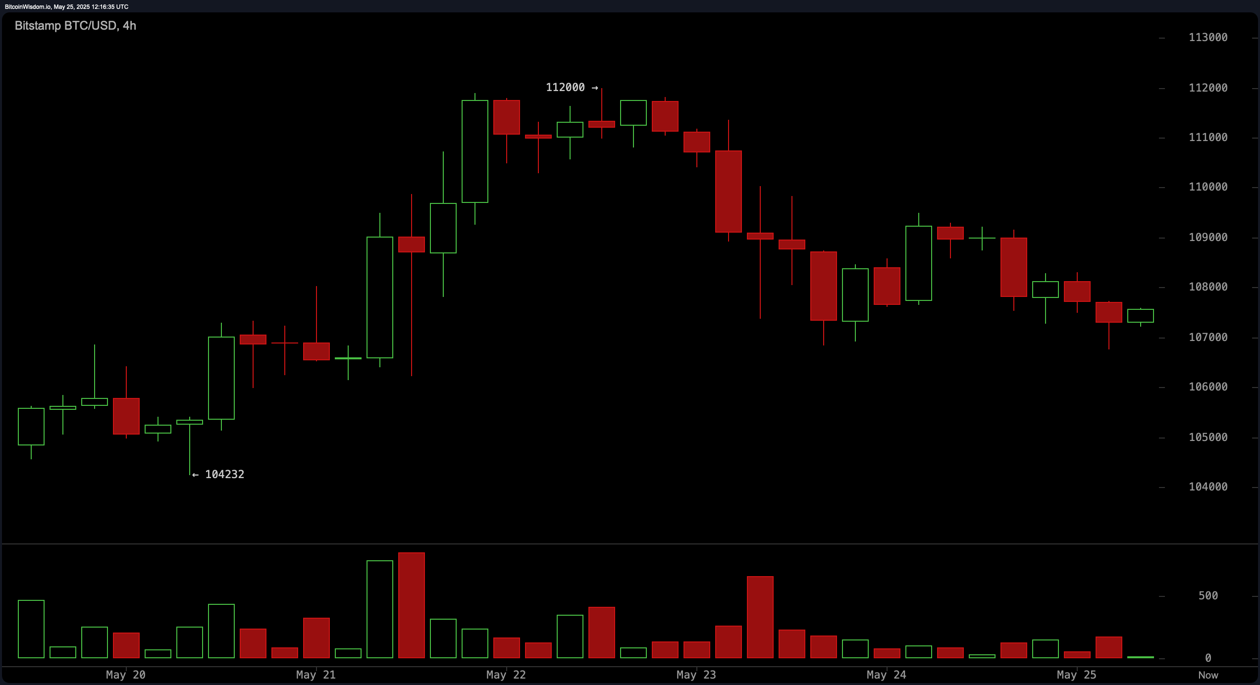 I 4-timers diagrammet følger bitcoin et rundetoppmønster, som initierer en nedadgående struktur etter toppen på $112,000. En serie lavere topper og bunner har materialisert seg, med et bearish volum som øker under fallet fra $111,000 til $107,000, som understreker selgerdominans. Kortsiktige tradere kan identifisere en mulighet hvis prisen spretter fra regionen $106,500–$107,000 med avtagende salgsvolum. Omvendt kan et bullish crossover over $108,500 med støttende volum representere et gyldig reverseringsinngangspunkt. Mulige utganger ligger innen $109,500 til $110,000-området, men en avgjørende bevegelse over $110,000 er nødvendig for å endre den nåværende biasen.