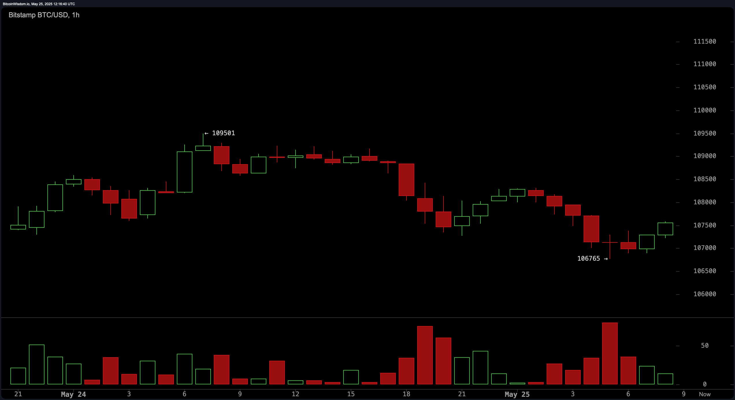 BTC/USD-timenoteringen indikerer at bitcoin forsøker å stabilisere seg etter en liten nedtrend, og stabiliserer seg rundt $106,765. Nylig prisutvikling antyder dannelsen av en potensiell dobbel bunn eller en subtil bullish divergens mellom pris og volum. Volumet har sunket på nedadgående bevegelser, men har vist en beskjeden økning med grønne lys, noe som signaliserer et potensielt skifte i momentum. Scalper-muligheter kan være til stede for aggressive intradagshandlere som går inn mellom $107,000 og $107,300, med stramme stopp under $106,700. Mer forsiktige deltakere kan overveie å gå inn etter et brudd over $108,000, med sikte på et kortsiktig mål mellom $108,800 og $109,500 mens trailing stop-losses benyttes når prisen stiger.