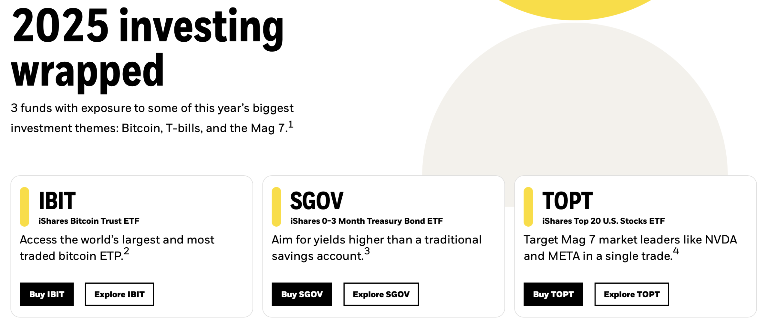 Den funksjonen signaliserer et bemerkelsesverdig skifte i tonen fra verdens største kapitalforvalter, som behandler bitcoin mindre som en nyhet og mer som en permanent porteføljepost. Seksjonen “2025 investing wrapped” grupperer IBIT med to kjente hovedstendere fra tradisjonell finans: kortsiktige statsobligasjoner via SGOV og store U.S. aksjer gjennom TOPT.