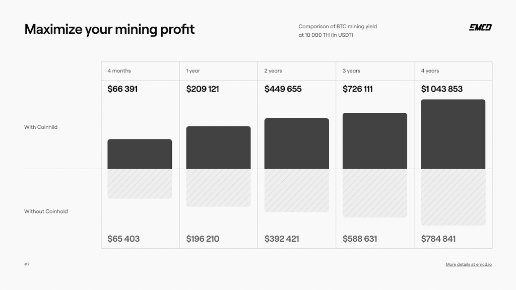 For investorer som søker en stabil og sikker måte å øke sine kryptoinnehav på, tilbyr Coinhold av EMCD et overbevisende alternativ til staking, trading eller bare å holde aktiva i en lommebok. Med konkurransedyktige renter, fleksible innskuddsalternativer og sterk sikkerhetsbacking, gir det en pålitelig løsning for generering av passiv inntekt.