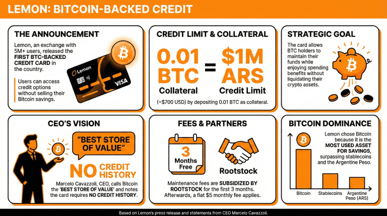 Hvilken ny innovasjon har Lemon introdusert i Argentinas kredittmarked? Lemon har lansert Argentinas første bitcoin-støttede kredittkort, som gjør det mulig for brukere å få tilgang til kreditt uten å selge sine BTC.
