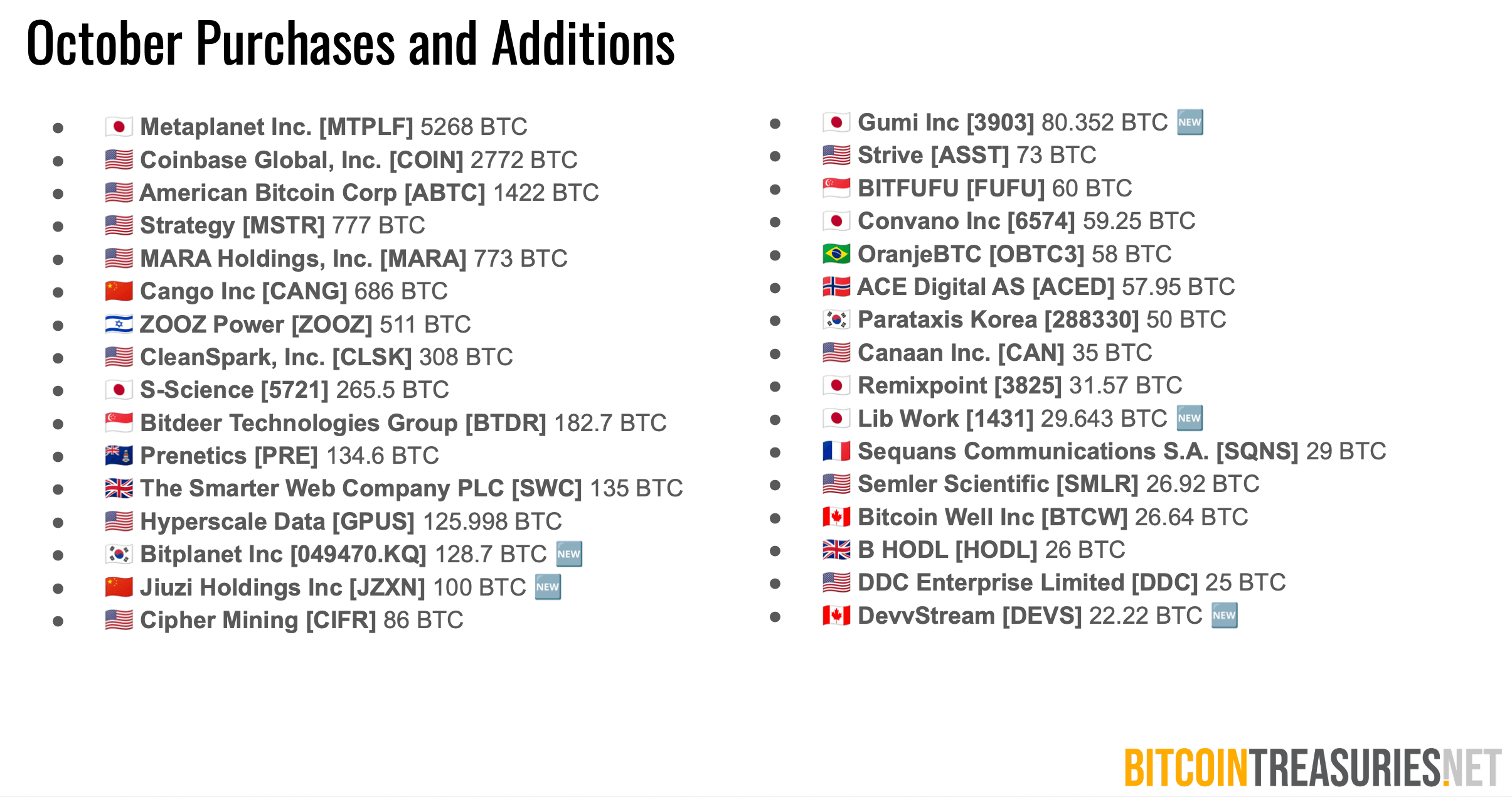 Metaplanet fremsto som oktobers største kjøper, og la til 5,268 BTC verdt 615 millioner dollar, etterfulgt av Coinbase sitt kjøp på 2,772 BTC og American Bitcoins 1,400 BTC tillegg. Metaplanet ruller også ut evige foretrukne aksjer i Japan for å øke bitcoin per aksje uten utvanning, mens Strive lanserte sin SATA-aksje, og tilbyr 12% årlige utbytter fra og med 15. desember 2025.