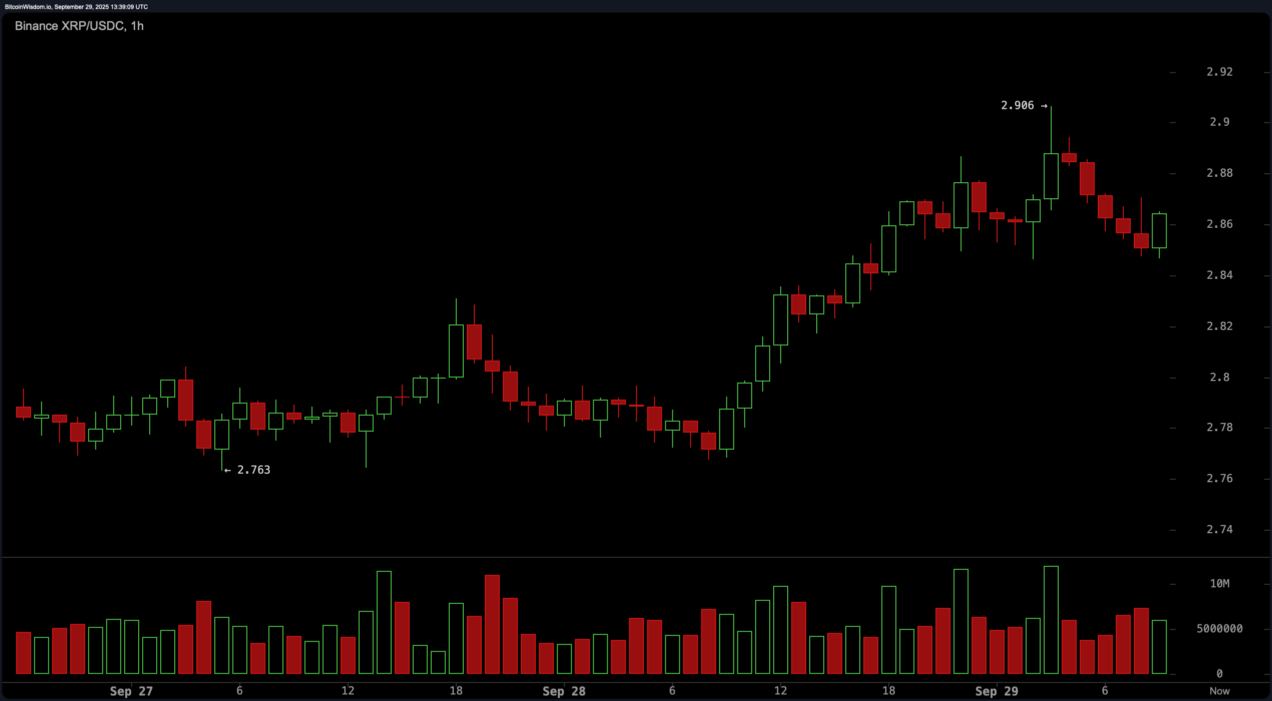XRPs 1-times chart gir sterke reality-TV-vibber: dramatiske bevegelser, plutselige gjenopprettinger, og spenning som holder seerne stadig tilbake. En mikro-opptur bar prisen fra $2.76 til $2.90 før den la på bremsene og gled over i konsolideringsmodus rundt $2.85–$2.87.