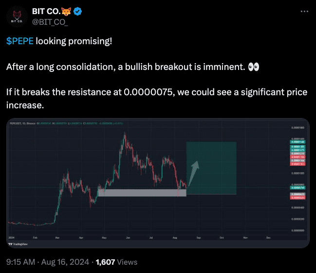 The analyst’s chart indicates a possible upside target of $0.0000154, which would represent a 95% increase from PEPE’s current price.
