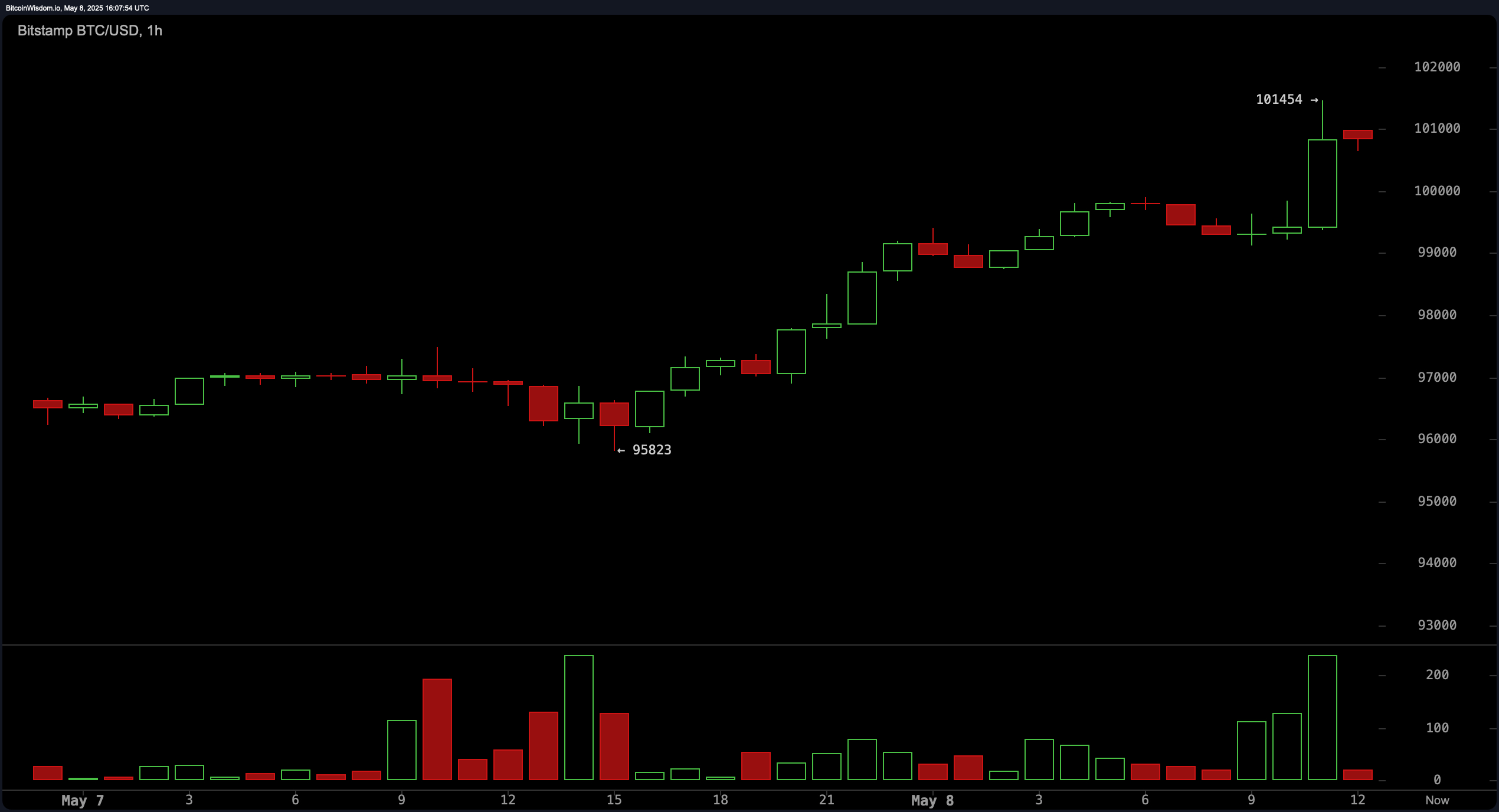 Bitcoin przebił sufit 100 000 dolarów w czwartek po raz pierwszy od lutego, osiągając najwyższy poziom, który rozpalił emocje wśród traderów. W czasie porannego handlu oscylował w okolicach 99 800 dolarów, by następnie wznieść się do śróddziennego szczytu na poziomie 101 454 dolarów. Wybicie korzysta z fali optymizmu na giełdach w USA po ogłoszeniu przez Trumpa, że nowe umowy handlowe z krajami takimi jak Wielka Brytania są bliskie zakończenia. Wzrost Bitcoina spowodował lawinę likwidacji na rynku kryptowalut – około 583,82 milionów dolarów w instrumentach pochodnych zostało wymazane, w tym brutalne 101 milionów dolarów wartości krótkich pozycji na Bitcoinie usuniętych w ciągu ostatniej godziny. Po osiągnięciu poziomu 101 454 dolarów cena nieco się obniżyła. Do południa czasu wschodniego w czwartek, BTC utrzymuje się na poziomie 100 691 dolarów – liczba nadal budząca emocje na całym rynku.
