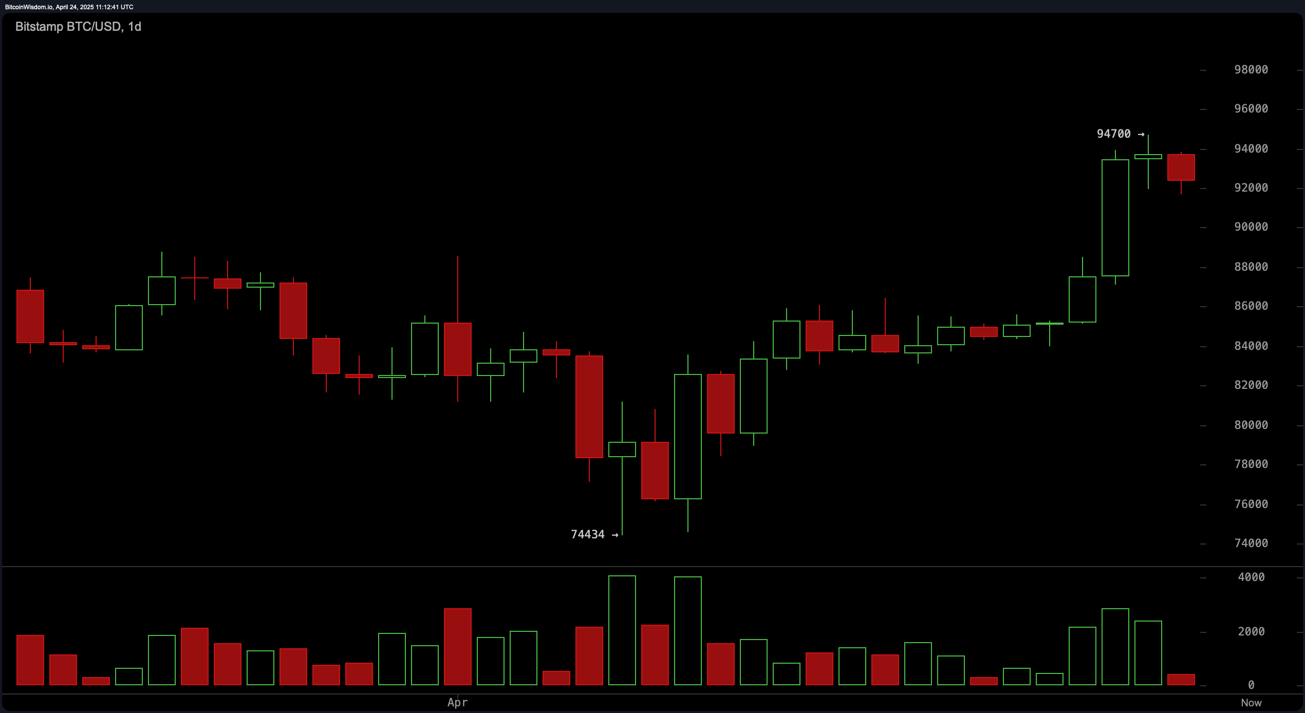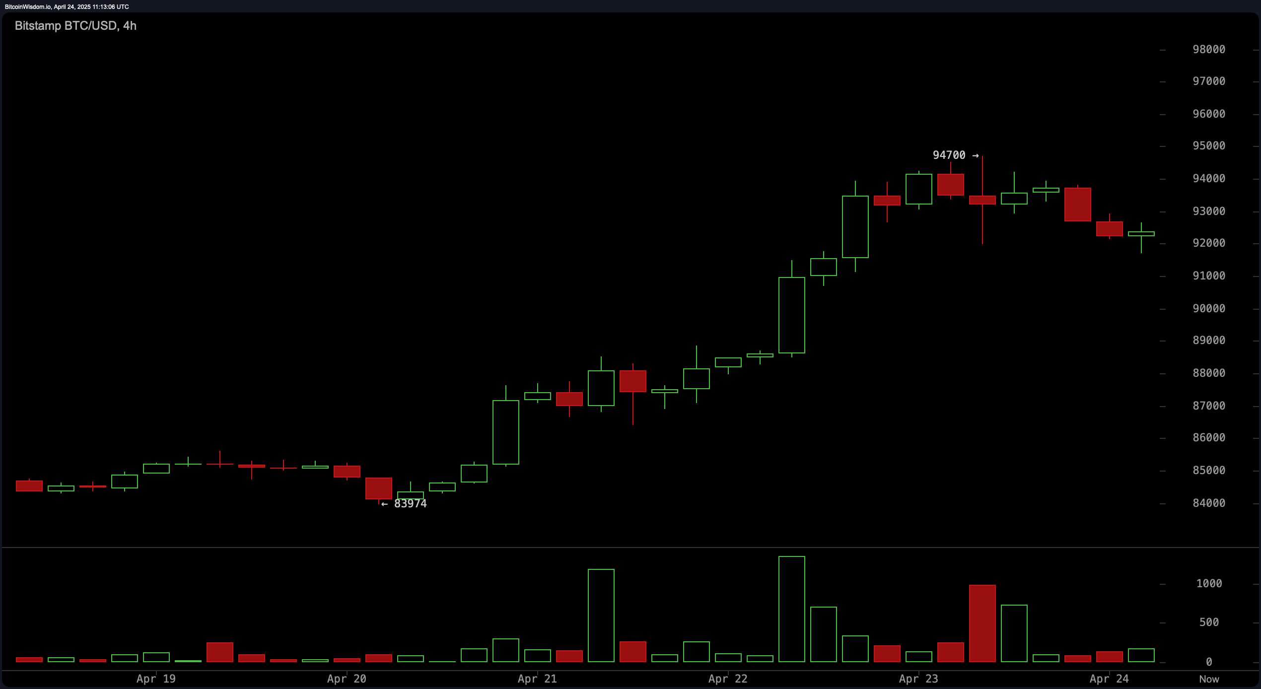 Analizując wykres czterogodzinny, bitcoin wykazuje oznaki ochładzania momentu po swoim niedawnym szczycie. Formacja zaokrąglonego szczytu, charakteryzująca się zstępującymi szczytami i niewielkim cofnięciem ceny, sugeruje krótkoterminową dystrybucję. Wolumen sprzedaży wokół szczytów potwierdza tę perspektywę, rzucając ostrożny cień na bycze układy. Jednak ponowna konsolidacja wokół obszaru $92,000 do $92,500, zwłaszcza jeśli jest poparta zredukowaną zmiennością i rosnącym wsparciem, może rozpalić odbicie. Ten scenariusz sprzyjałby taktycznemu wejściu z ochronnym stopem, celując w ponowne wyzwanie oporu na poziomie $94,000, w zależności od powrotu siły kupujących.