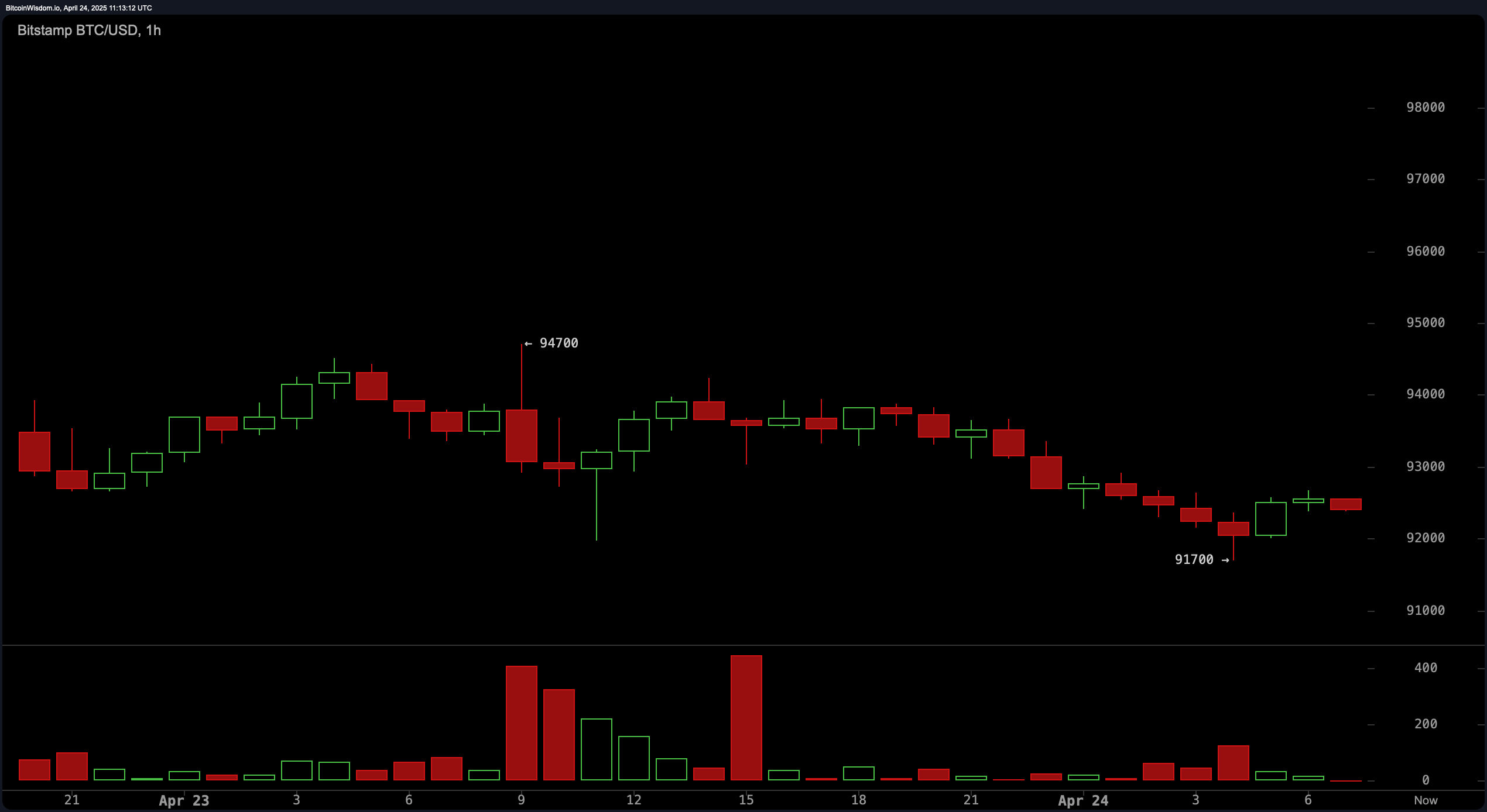 Wykres jednokreskowy prezentuje mikro-niedźwiedzią strukturę w bitcoinie, zapoczątkowaną odrzuceniem na poziomie $94,700. Ten szczyt oznaczył punkt zwrotny, wywołując spadek, który ponownie przetestował wsparcie na około $91,700. Następnie nastąpiło skromne odbicie, sugerujące przejściowe akumulacje. Jednak wzorzec niższych szczytów i niższych dołów, połączony z rosnącym czerwonym wolumenem, sugeruje przeważający momentum sprzedażowy. Ta niedźwiedzia skłonność wymaga uważnego monitorowania, zwłaszcza dla traderów intraday kierujących się szybkimi odwróceniami. Potencjalne ustawienie scalpowe może się pojawić, jeśli bitcoin ponownie przetestuje $91,700 i utworzy wyższy dołek przy zmniejszonej presji sprzedażowej, celując w wzrost do poziomu $93,000.