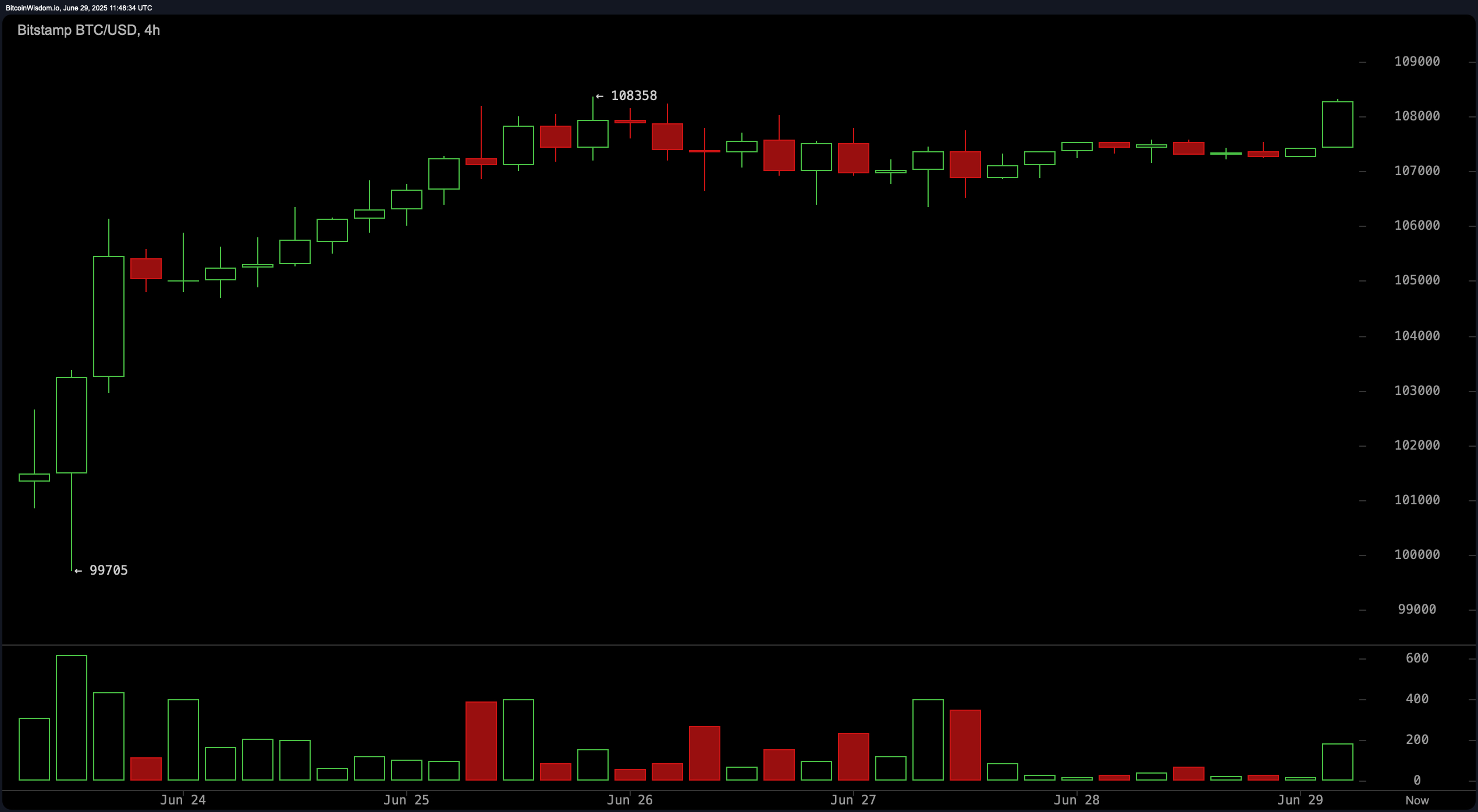 Z perspektywy średnioterminowej, 4-godzinny wykres BTC/USD ilustruje formację byczej flagi, podkreśloną stopniowym wzrostem. Świeca wybicia w pobliżu poziomu $108,358 towarzysząca wyraźnemu wzrostowi wolumenu wskazuje, że kupujący zyskują pewność. Jeśli cena ponownie przetestuje region od $107,000 do $107,500 z sukcesem, może to oznaczać niższe ryzyko dla pozycji byczych. Odwrotnie, trwały ruch poniżej $106,800 unieważniłby tę krótkoterminową strukturę i wymagałby ponownej oceny kierunkowej.