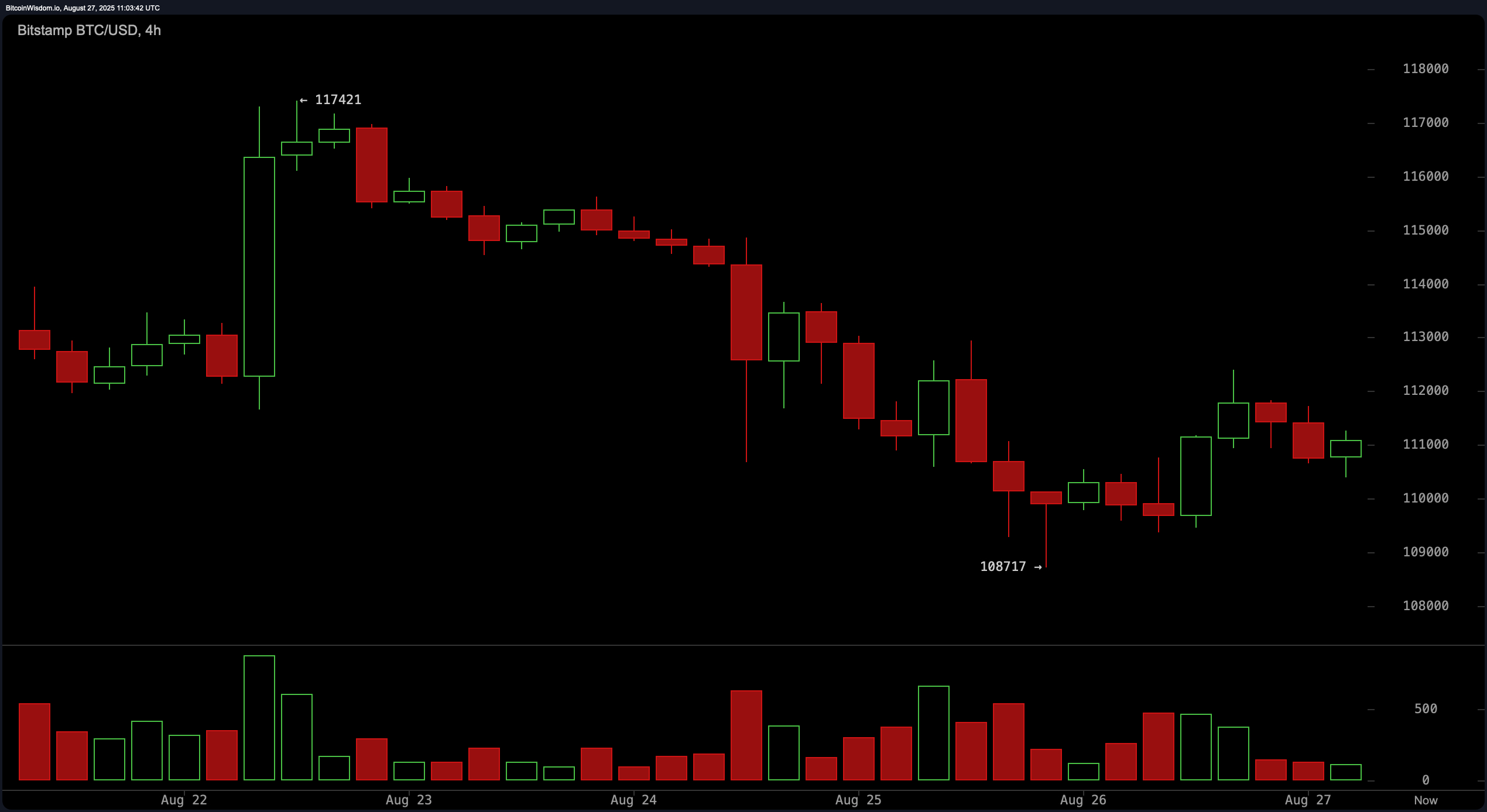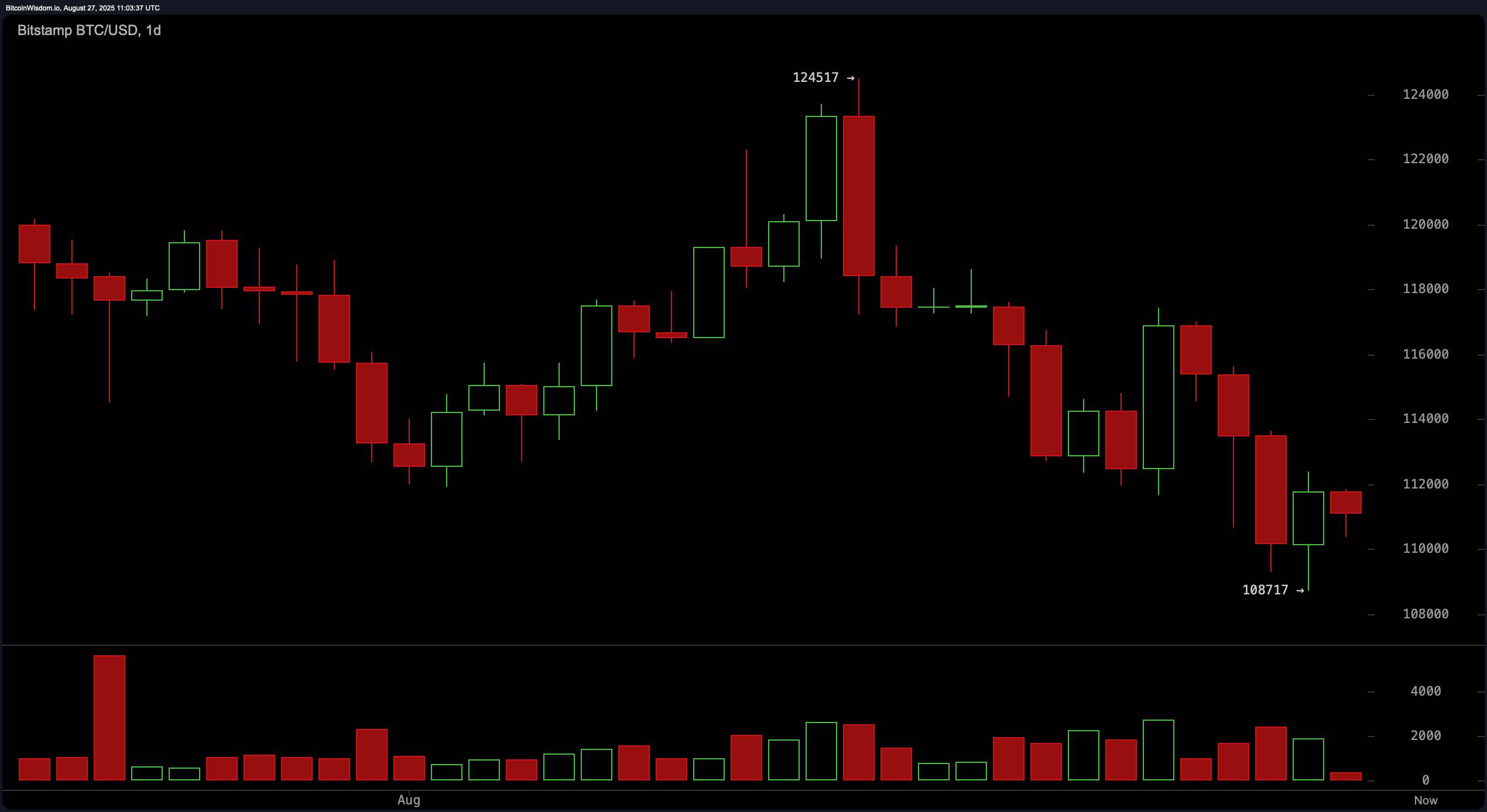 Bitcoin pozostawał pod presją 27 sierpnia, handlując na poziomie 111,036 USD z oznakami krótkoterminowej akumulacji, ale ze słabością w szerszym trendzie. Kapitalizacja rynkowa wiodącej kryptowaluty wynosiła 2,21 bilionów USD, podczas gdy jej 24-godzinny wolumen obrotu osiągnął 39,66 miliardów USD, z zasięgiem w ciągu dnia między 109,526 a 112,279 USD.