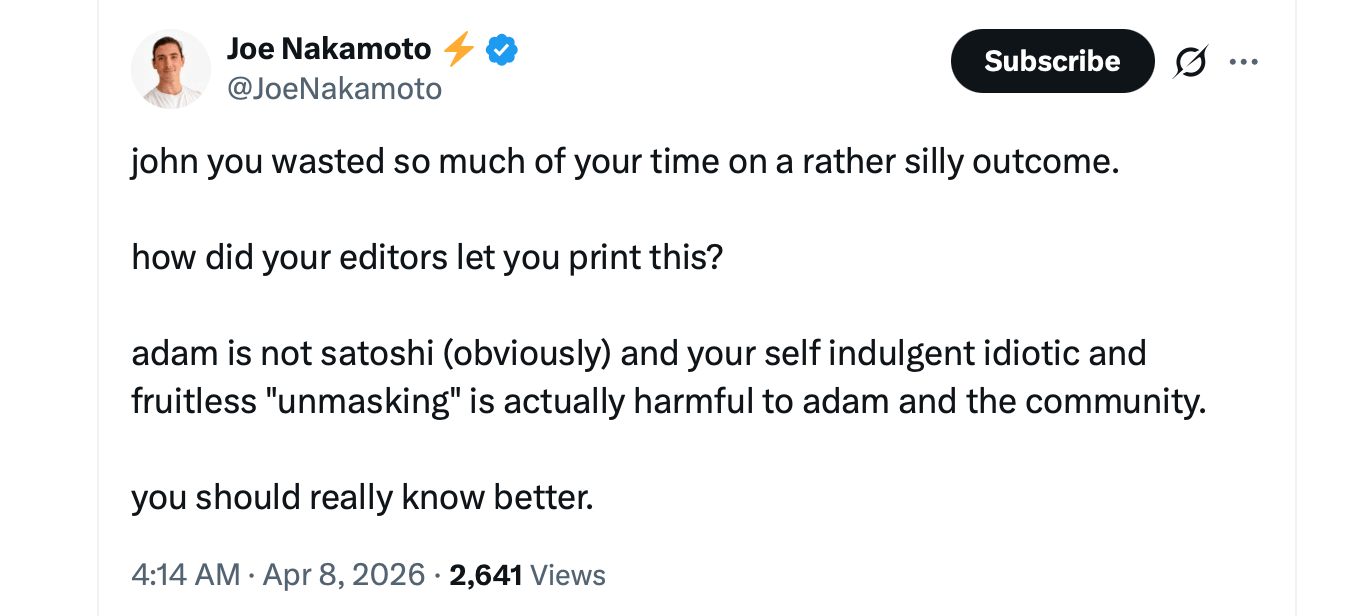 „Tego rodzaju bezsensowne dziennikarstwo demaskujące stawia prawdziwą osobę na celowniku, nie przynosząc absolutnie żadnej korzyści publicznej” – odpowiedziała jedna osoba na artykuł dziennikarza. „Widzieliśmy już, jak to wygląda w przypadku nękania i strachu, jakie spadły na rodzinę Hala Finneya po poprzednich falach spekulacji dotyczących Satoshiego. Jeśli twoja sprawa zaczyna się i kończy na „tych samych kręgach, tym samym słownictwie, tej samej epoce”, to nie jest to raczej rewelacja, a raczej fan fiction z potencjalnymi skutkami ubocznymi. Idź się pieprzyć, John”.