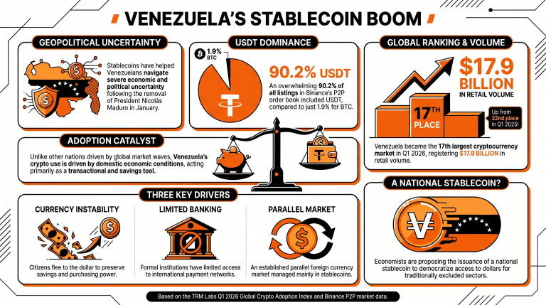 W najnowszym raporcie TRM Labs dotyczącym globalnego upowszechniania kryptowalut podkreślono, że stablecoiny są wykorzystywane w Wenezueli jako jeden ze środków stosowanych przez użytkowników indywidualnych w celu radzenia sobie z wysoką inflacją i ograniczeniami kapitałowymi, przeciwdziałając niestabilności walutowej i kontrolom kapitałowym w obliczu gwałtownego wzrostu równoległych rynków walutowych.