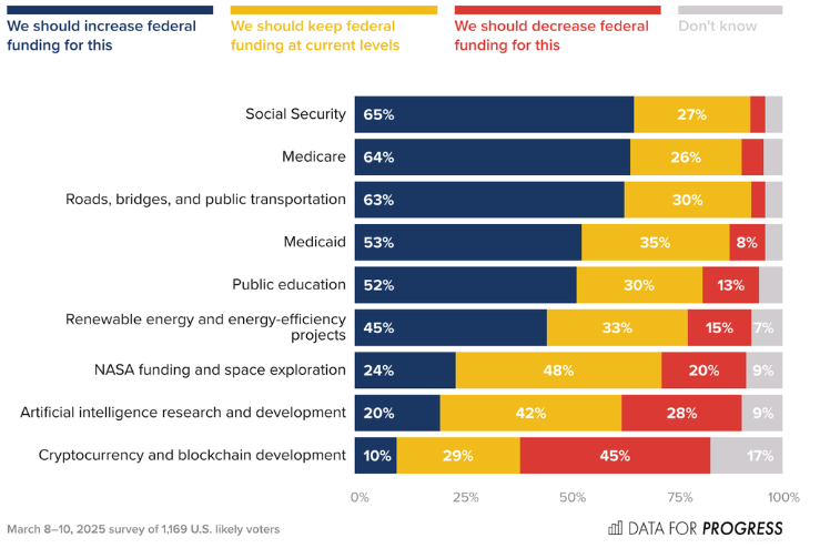 According to Data for Progress, a left-of-center public opinion research group, few U.S. voters—about 10% of survey respondents—want the Trump administration to increase federal funding for cryptocurrency and blockchain development. Instead, many prefer the U.S. government to spend more on Social Security (65%), Medicare (64%), transportation infrastructure, and other priorities.
