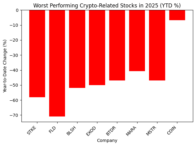 Mineradores de bitcoin e empresas de ativos digitais como IREN, Cipher Mining e Applied Digital registraram alguns dos maiores ganhos acumulados do ano nos mercados dos EUA. - Quais ações relacionadas a criptomoeda enfrentaram mais dificuldades em 2025?