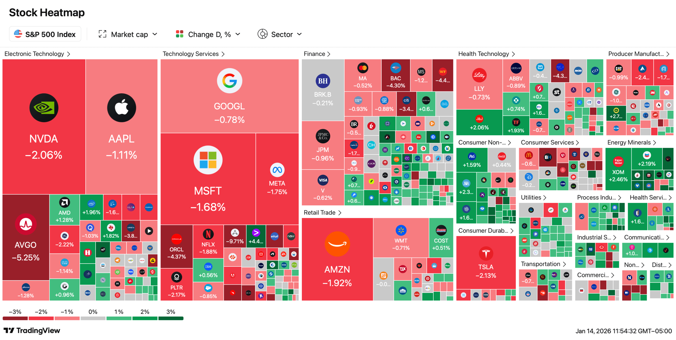 Na quarta-feira, após a retração de terça-feira, as ações dos EUA estão caindo generalizadamente, com tinta vermelha espalhada sobre todos os principais índices. As ações não estão acompanhando o ritmo dos metais preciosos—ouro e prata continuam em alta—enquanto a economia cripto adicionou 3,66% no último dia, subindo para $3,29 trilhões.