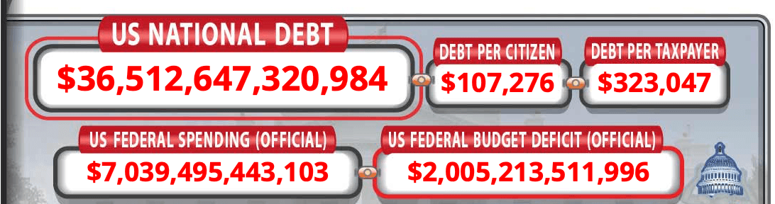 Estes incluíram pacotes de resgate para instituições financeiras e montadoras, juntamente com benefícios emergenciais de desemprego. Em 2017, a dívida havia subido para US$ 20 trilhões após anos de gastos deficitários sob administrações tanto republicanas quanto democratas. Compromissos militares em andamento continuaram a contribuir para o total, enquanto trilhões mais foram alocados para combater as consequências econômicas da pandemia de Covid-19. Segundo o Rastreador de Dinheiro do COVID, o total autorizado de financiamento de alívio pandêmico excedeu US$ 4,6 trilhões.