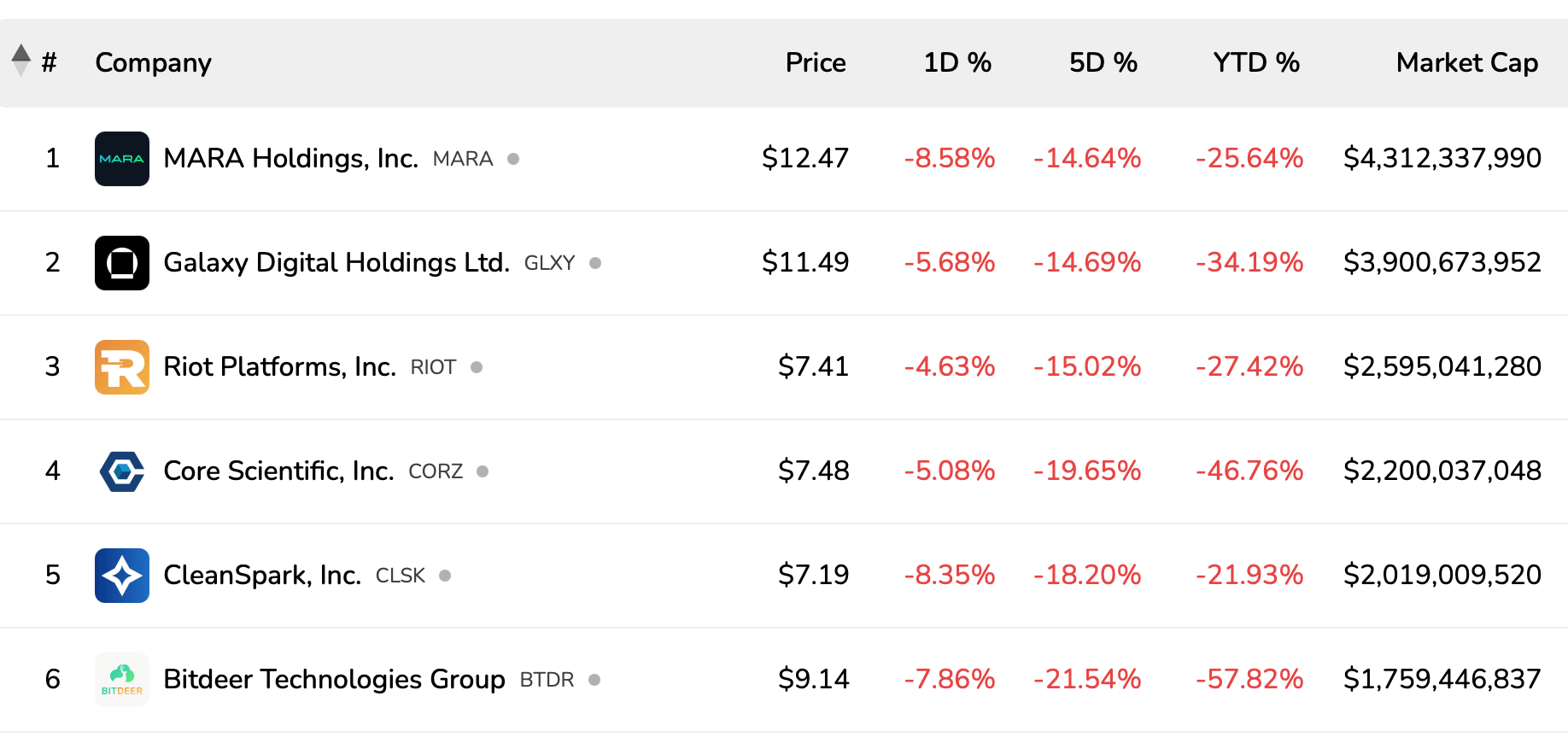 Veja o COIN da Coinbase, por exemplo, que declinou 11,93% em relação ao dólar americano desde segunda-feira. A capitalização de mercado atual do COIN é de $44,16 bilhões. Enquanto isso, a MSTR da Strategy experimentou uma queda de 8,46% ao longo de cinco sessões de negociação consecutivas. Empresas de mineração de capital aberto também sofreram perdas significativas, com as ações da MARA Holdings recuando 14,64%.