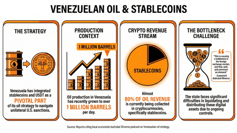 A Venezuela integrou stablecoins, particularmente USDT, em sua estratégia petrolífera, com quase 80% da receita do petróleo coletada em criptomoedas. -