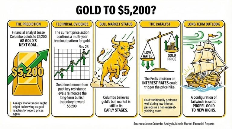 Jess Colombo, um analista financeiro de metais, afirma que os movimentos recentes podem indicar uma grande alta no preço do ouro a curto prazo. Ele afirma que a ruptura preliminar que ocorreu em 28 de novembro aponta para $5.200 como um novo objetivo de preço.