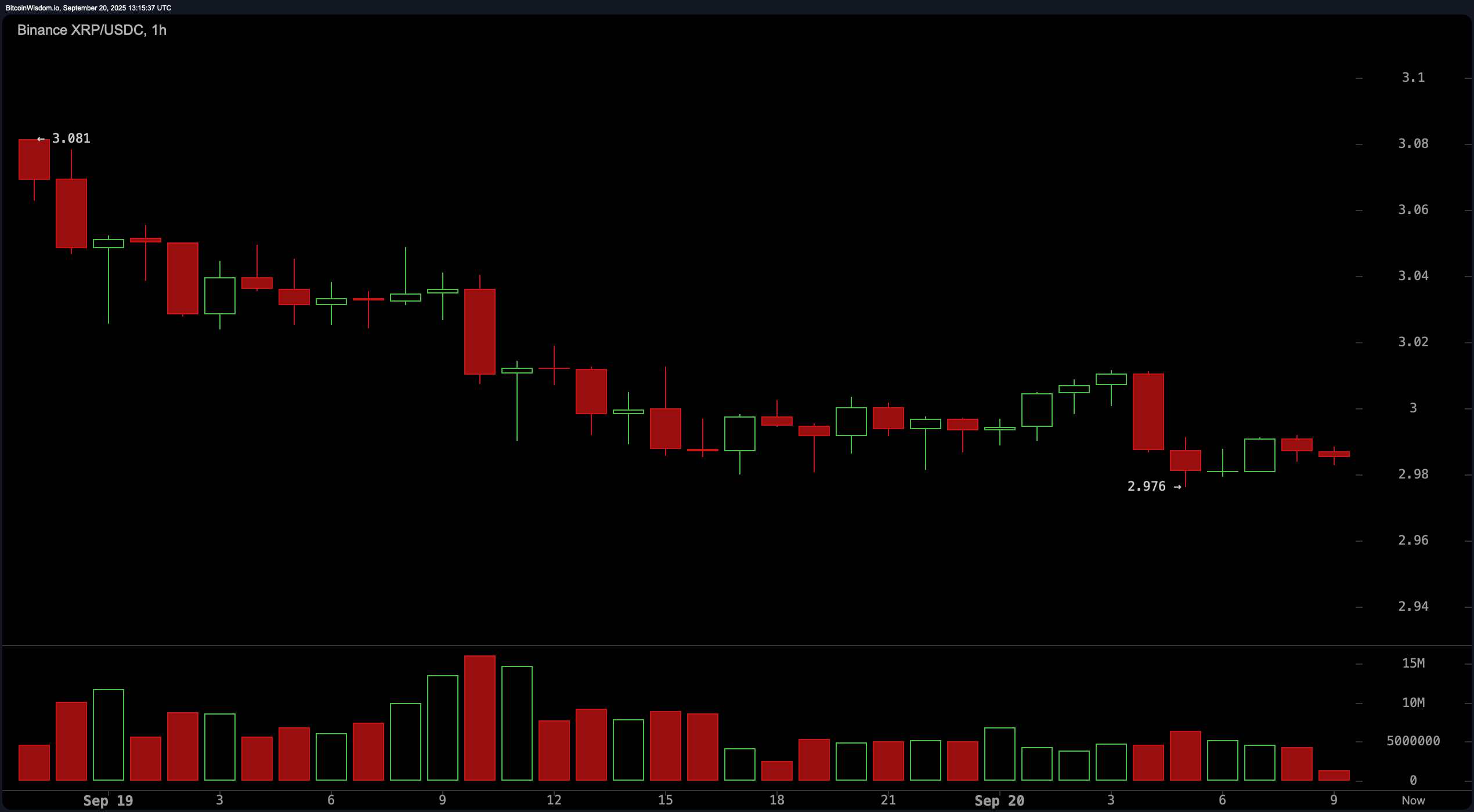No gráfico de 1 hora, o XRP exibiu uma fraca tendência de baixa passando para a consolidação. A ação do preço caiu de $3,08 para uma mínima de $2,976 antes de entrar em um padrão lateral marcado por velas de corpo pequeno, sugerindo indecisão do mercado.