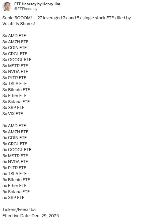 Volatility Shares tocmai a aprins cursa ETF-urilor prin depunerea unei seturi revoluționare de 27 de produse extrem de pârghiate – prezentând o expunere fără precedent de 5x la bitcoin, XRP, ether, solana și acțiuni de top – semnalând o schimbare de proporții în accesul la tranzacționarea turbocharged de criptomonede și acțiuni.