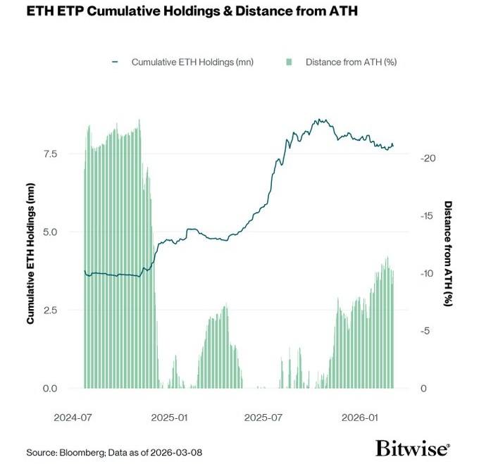 Investitorii instituționali continuă să mențină expunerea la ethereum în ciuda presiunii semnificative a pieței, după cum a arătat Bitwise Europe într-o analiză publicată pe platforma de socializare X pe 11 martie, evidențiind poziționarea rezilientă a instituțiilor chiar și după o scădere abruptă față de maximul atins de activ în 2025.