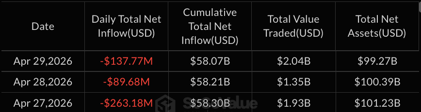 Откат криптовалютных биржевых фондов (ETF) ускорился в среду, 29 апреля, на фоне устойчивого давления со стороны продавцов как по биткоин-продуктам, так и по эфир-продуктам. То, что начиналось как пауза, теперь больше похоже на краткосрочную перепозиционировку.