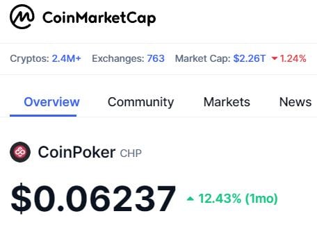 Согласно данным с DEX Screener, криптовалюта CHP имеет рыночную капитализацию чуть более $10 миллионов и выросла более чем на 12% за последний месяц, возможно, поскольку больше игроков присоединились к CoinPoker для участия в CSOP и CSOP+.
