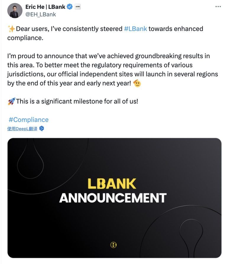 14 октября Эрик Хе, главный ангел-офицер и советник по управлению рисками LBank, поделился взглядами на будущие рыночные планы биржи и глобальную стратегию соответствия нормативным требованиям в социальных сетях. Он отметил: “Чтобы лучше соответствовать требованиям различных юрисдикций, наши официальные независимые сайты будут запускаться в нескольких регионах к концу этого года и в начале следующего года!”