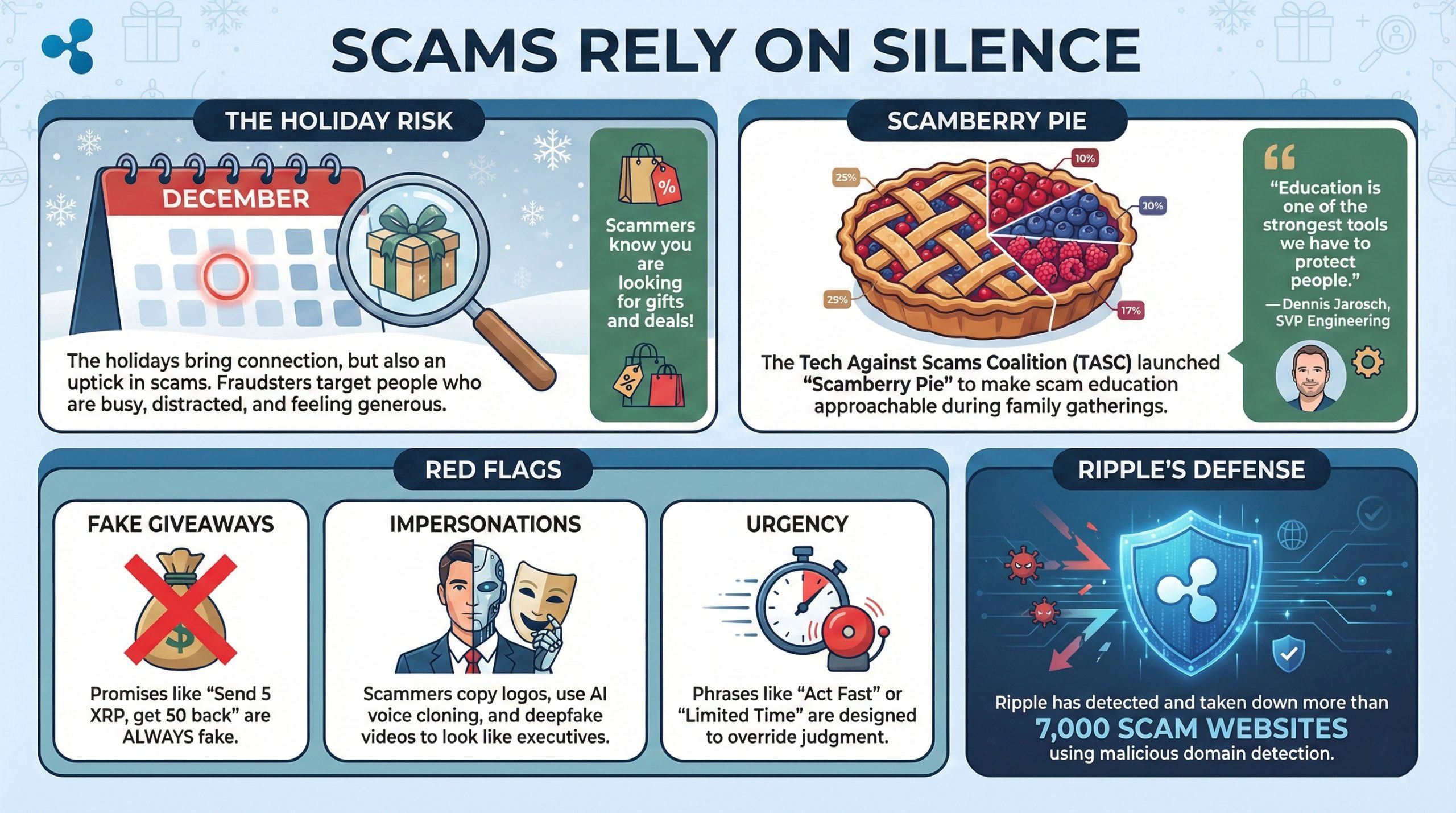 Ripple на этой неделе выпустила сообщение, подчеркивающее усиление мошенничества в праздничный сезон и призывающее потребителей распознавать сигналы связанных с криптой афер. Компания отметила, что мошенники часто используют конец года в онлайн-активности, делая образование и раннее обнаружение важными для снижения виктимизации в период, когда цифровые взаимодействия обычно увеличиваются.