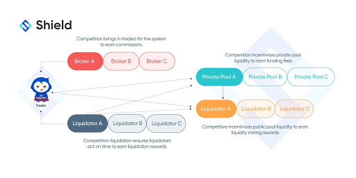 Shield’s decentralized network is maintained by four key constituents: broker, private pool LP, public pool LP and liquidator. The transmission is executed via the governance token – SLD.