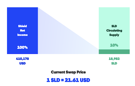 Shield generates a buyback price by maintaining 10% of the total SLDs in circulation as always equal to 100% of the value of the buyback pool (derived from 90% of the transaction fees), while the SLDs mined are redeemed by swap&burn contract (as shown above).