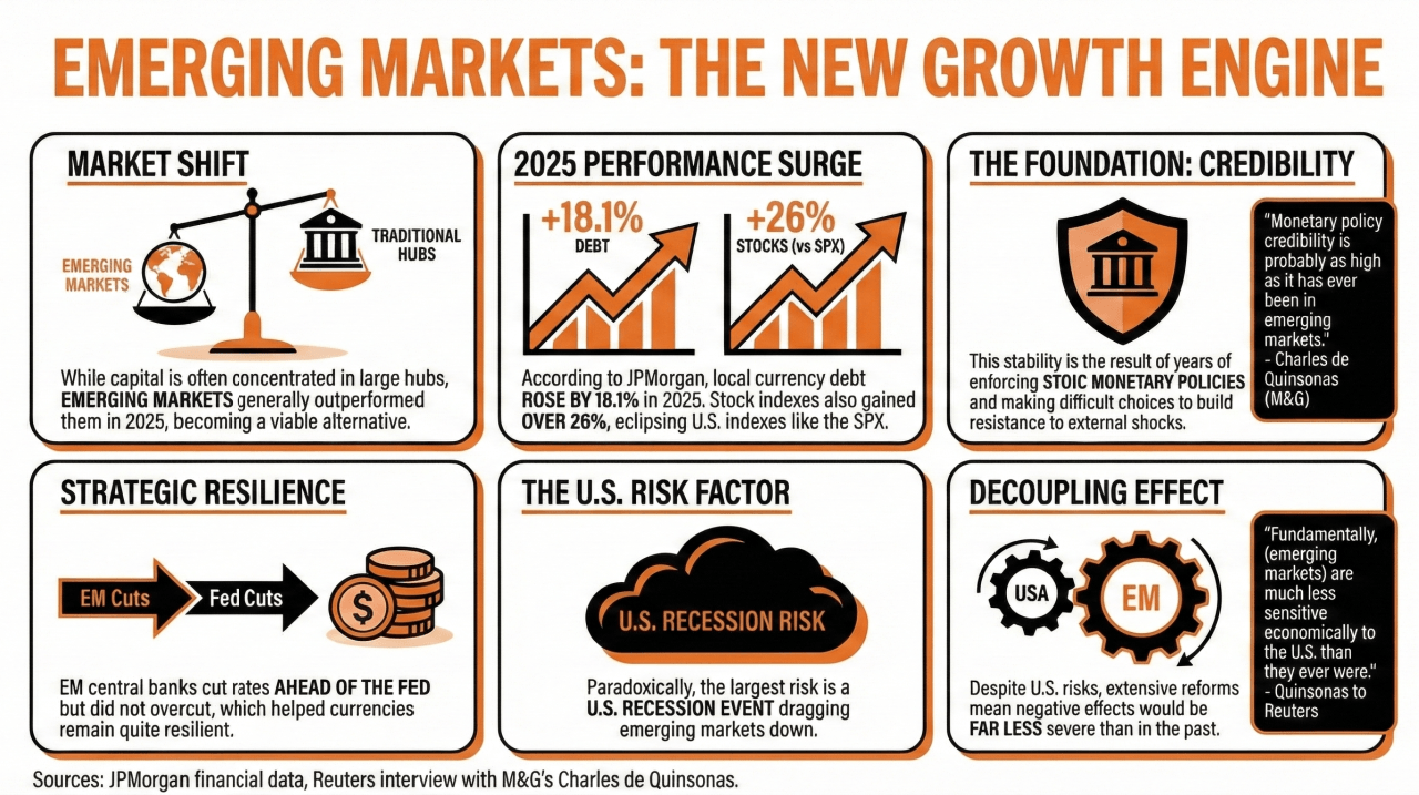Rozvíjajúce sa trhy dôsledne prekonávali väčšie finančné centrá, pričom dlh v miestnej mene vzrástol o 18,1% a akciové indexy získali nad 26% v roku 2025. - Aké faktory prispeli k stabilite rozvíjajúcich sa trhov?