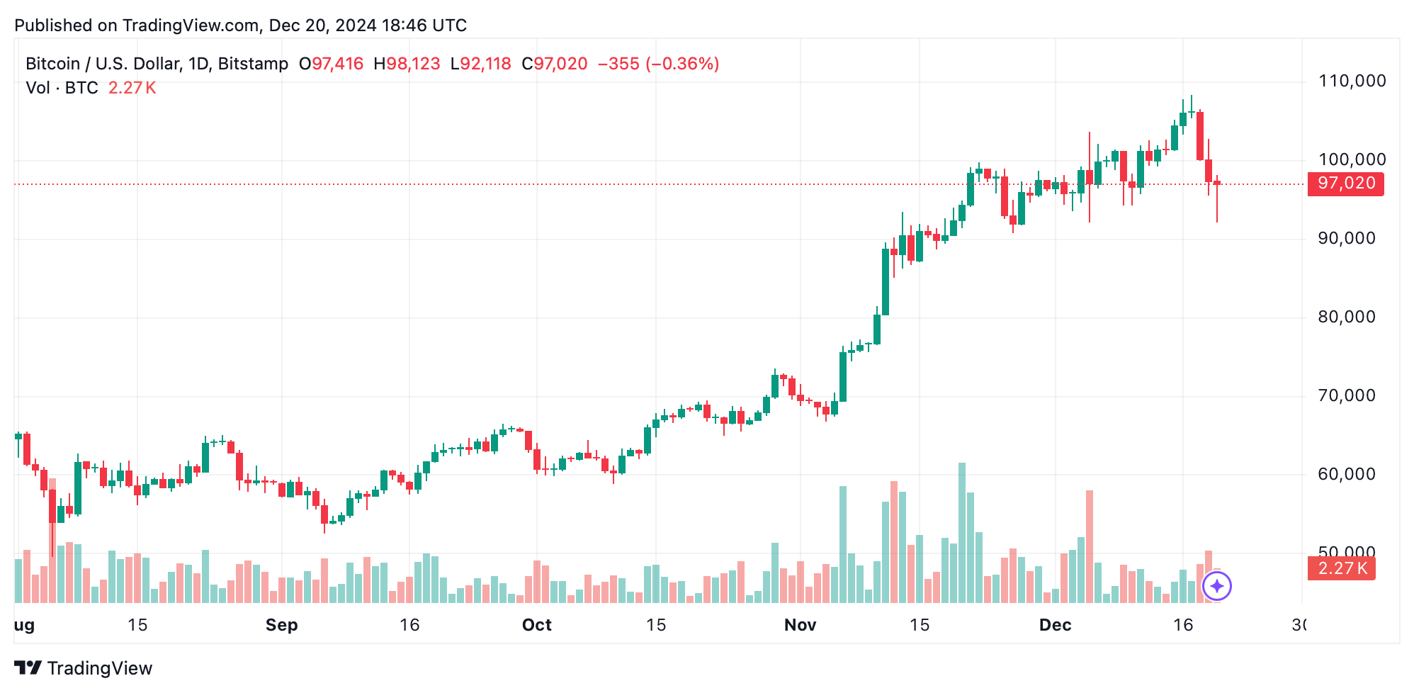 På fredagseftermiddagen verkade kryptomarknaderna ta en paus, även om handlare förblev på helspänn och förberedda på bitcoins nästa vändning. Vid presstiden handlades BTC för $96,800 till $97,150 per mynt, medan den bredare kryptoekonomin stod på $3,34 biljoner—en nedgång på 2,7% efter viss återhämtning.