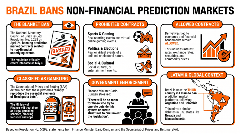 Regleringen, som träder i kraft den 4 maj, gör Brasilien till det tredje landet i Latinamerika som förbjuder plattformar för prognosmarknader i viss utsträckning, efter Argentina och Colombia.