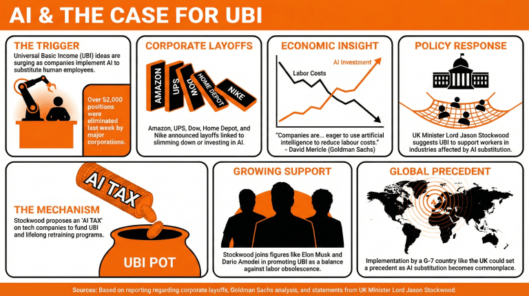 När denna komplexa situation utvecklas, hänvisade den brittiske investeringsministern, Lord Jason Stockwood, till möjligheten att anta ett UBI-program för att stödja arbetstagare i industrier som påverkas av AI-substitution.