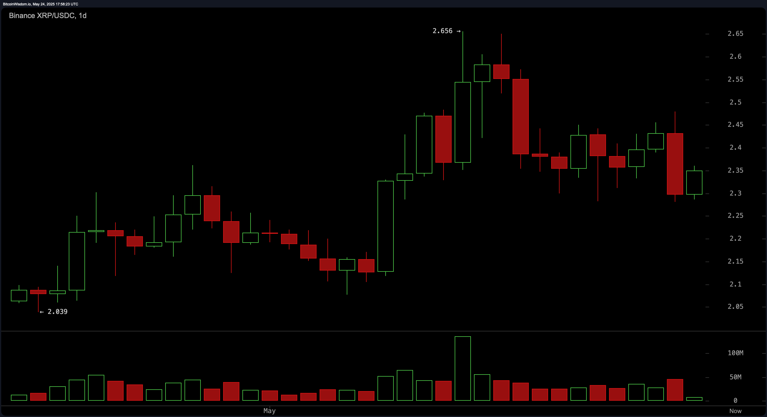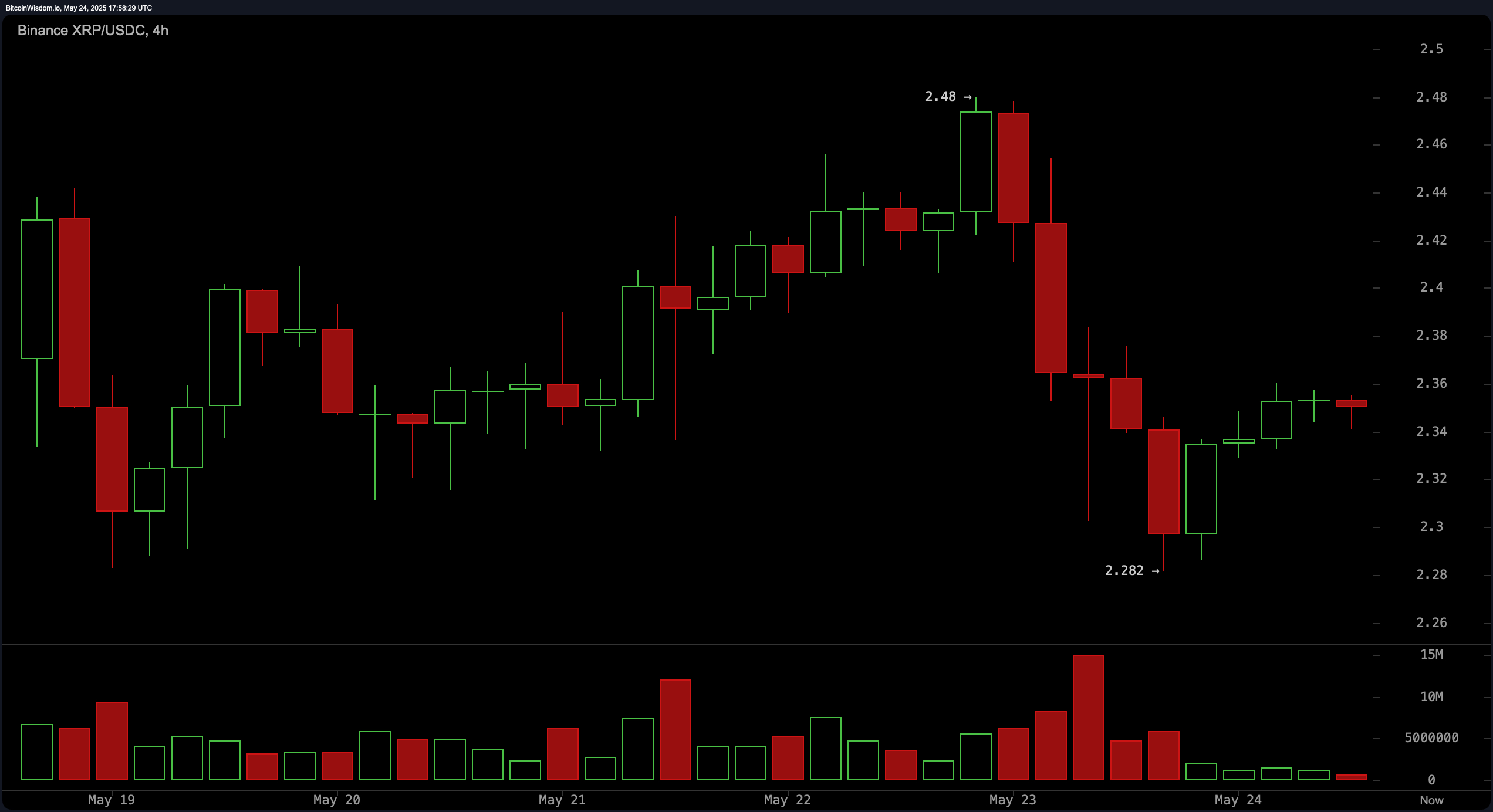 På fyra-timmars (4H) diagrammet försöker XRP stabilisera sig efter en nylig botten på $2.282 som etablerades den 23 maj. Denna nivå visade ett köpintresse och snabb återhämtning, vilket tyder på att det kan fungera som en kortsiktig botten. Tillgången konsolideras mellan $2.33 och $2.36, medan motståndet vid $2.48, en tidigare lägre topp, förblir formidabelt. En aggressiv lång ingång kan övervägas om priset bryter och återtestar området $2.37–2.38 med bekräftande volym. En potentiell vinsttagningszon ligger nära $2.47–2.48, i linje med historiska utbudszoner.